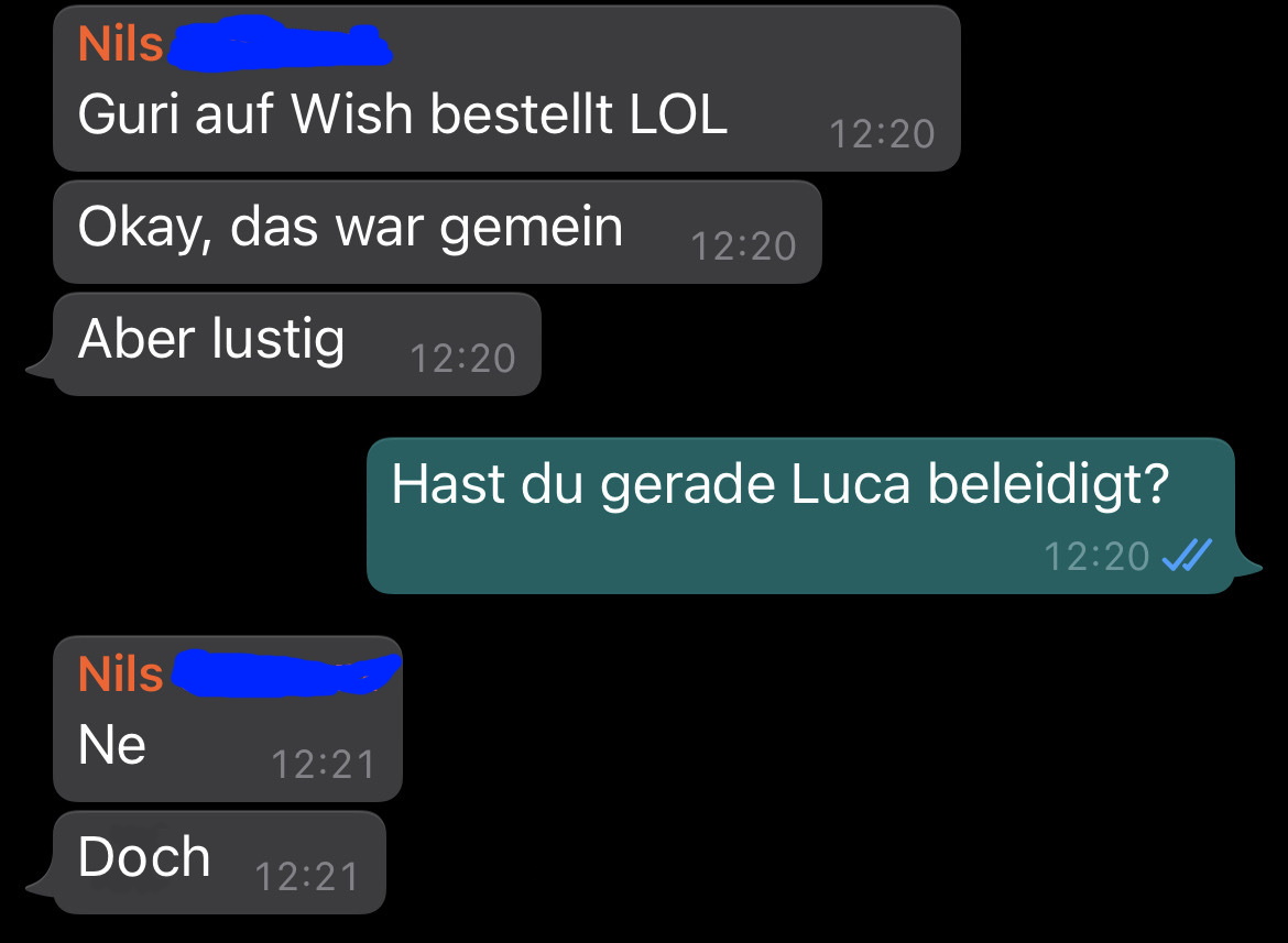 Da hast du aber ziemlich lange gebraucht um den ältesten Trick der Chatverlaufmanipulation aus der Trickkiste zu ziehen..