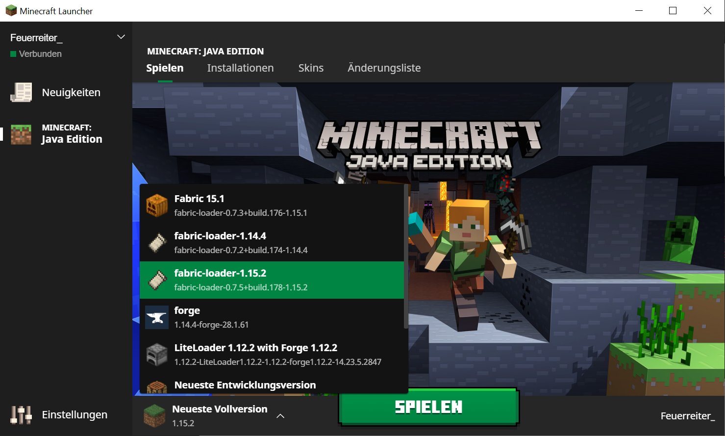 Ich empfehle nun den Launcher einmal zu starten. Dieser sollte nun eine neue "Installation" haben, genannt "fabric-lader-1.15.1". Und einmal auf Spielen zu klicken. Nachdem nun im Zweifelsfall alle fehlenden Bibliotheken heruntergeladen wurde, können wir das Spiel wieder schließen.